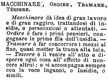 | Macchinare, Ordire, Tramare, Tessere - Macchinare dà idea di gran lavoro e di gran raggiro, trattandosi di insidie, e persecuzioni o attentati. Ordire è fare i primi pensieri, congegnare le prime fila dell'insidia. Tramare è far concorrere i mezzi al fine, quasi metter la trama alla tela. Tessere è il venire all'atto e disporre ogni cosa all'effetto di nuocere altrui; e si accompagna sempre con la voce Inganni, o Insidie, o simili. [immagine] |