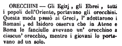 | Orecchini - Gli Egizj, gli Ebrei, tutti i popoli dell'Oriente, portavano gli orecchini. Questa moda passò ai Greci, l'adottarono i Romani, ed Isidoro osserva che in Atene e Roma le fanciulle avevano un'orecchino a ciascun'orecchio, mentre i giovani lo portavano ad uno solo. [immagine] |