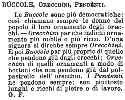 Buccole, Orecchini, Pendenti - Le Buccole sono più democratiche: così chiamano sempre le donne del popolo il loro ornamento degli orecchi. - Orecchini par che indichi ornamento più nobile o più ricco. D'una signora si direbbe sempre Orecchini. E poi Buccole par più proprio di quelle che pendono giù dagli orecchi; Orecchini di quelli ornamenti a modo di bottoni che non pendono giù dal polpastrello dell'orecchio. I Pendenti ne pendono sempre; son piuttosto lunghi e ricchi di pietre o di lavoro.