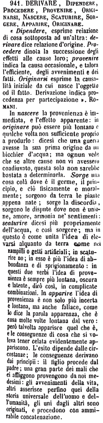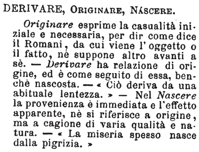Derivare, Dipendere, Procedere, Provenire, Originarsi, Nascere, Scaturire, Sorgere, Apparire, Originare - « Dipendere, esprime relazione di cosa sottoposta ad un'altra: derivare dice relazione d'origine. Procedere dinota la successione degli effetti alle cause loro; provenire indica la causa occasionale, e talora l'efficiente, degli avvenimenti e dei fatti. Originarsi esprime la causalità iniziale da cui nasce l'oggetto od il fatto. Derivazione indica procedenza per partecipazione ». Romani.
