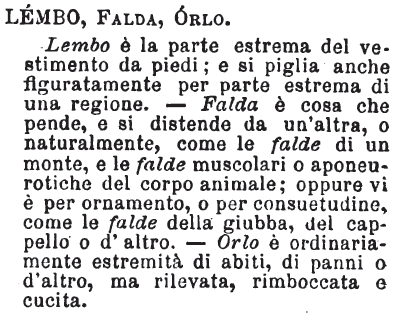 | Lembo, Orlo, Bordo, Fimbria, Falda, Pistagna, Tesa, Golino, Solino - «Lembo, la parte estrema del vestimento dappiedi. Orlo, l’estremità qualunque di panno cucito. S’usano ambedue nel traslato: ma lembo indica estremità più lata che orlo. Orlo significa, d’ordinario, estremità rilevata, rimboccata. Bordo, la parte estrema del vascello che dai fianchi sta fuor dell’acqua. Usato per estremità in genere è gallicismo. Fimbria è parola d’erudizione: ed era orlo con incisioni e frastagli o ricami. Falda è più che gli altri: parlando di giubba, vale quella parte che dalle anche scende fin presso la gamba; parlando di cappello, è l’ala di quello, che più comunemente dicesi tesa. E falda può dirsi qualunque parte del vestito sia soprammessa all’estremità, e ricucitavi. Pistagna, l’estremità dell’abito dalla parte di sopra, sorgente in collare». Romani.
