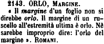 | Orlo, Margine - « Il margine d'un foglio non si direbbe orlo. Il margine di un ruscello all'estremità ultima è orlo. Nè sarebbe improprio dire: l'orlo del margine ». Romani. [immagine] |