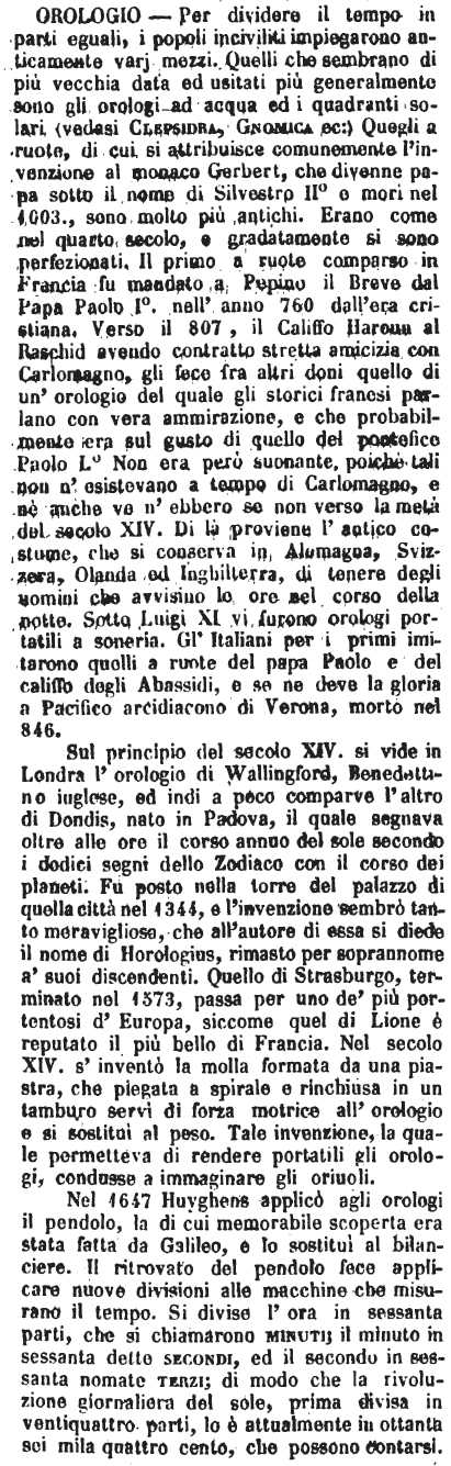 | Orologio - Per dividere il tempo in parti eguali, i popoli inciviliti impiegarono anticamente varj mezzi. Quelli che sembrano di più vecchia data ed usitati più generalmente sono gli orologi ad acqua ed i quadranti solari (vedasi Clepsidra, Gnomica ec:) Quegli a ruote, di cui si attribuisce comunemente l'invenzione al monaco Gerbert, che divenne papa sotto il nome di Silvestro II° e morì nel 1003., sono molto più antichi. Erano come nel quarto secolo, e gradatamente si sono perfezionati. Il primo a ruote comparso in Francia fu mandato a Pepino il Breve dal Papa Paolo I°. nell'anno 760 dell'era cristiana. Verso il 807, il Califfo Haroun al Raschid avendo contratto stretta amicizia con Carlomagno, gli fece fra altri doni quello di un'orologio del quale gli storici franesi parlano con vera ammirazione, e che probabilmente era sul gusto di quello del pontefice Paolo I°. Non era però suonante, poichè tali non n'esistevano a tempo di Carlomagno, e nè anche ve n'ebbero se non verso la metà del secolo XIV. Di là proviene l'antico costume, che si conserva in Alemagna, Svizzera, Olanda ed Inghilterra, di tenere degli uomini che avvisino le ore nel corso della notte. Sotto Luigi XI vi furono orologi portatili a soneria. Gl'Italiani per i primi imitarono quelli a ruote del papa Paolo e del califfo degli Abassidi, e se ne deve la gloria a Pacifico arcidiacono di Verona, morto nel 846.