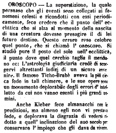 Oroscopo - La superstizione, la quale persuase che gli eventi sono collegati ai fenomeni celesti e ricondotti con essi periodicamente, fece credere che il punto dell'ecclittica che si alza al momento della nascita di una creatura dovesse presagire il di lei futuro destino. Questo errore rese celebre quel punto, che si chiamò l'oroscopo. Si studiò pure il posto del sole nell'ecclittica, il punto dove quel cerchio taglia il meridiano ec: L'astrologia giudiciaria credè di scorgervi altrettanti indizj di un sicuro avvenire. Il famoso Ticho-Brahè aveva la più cieca fede in tali chimere, e le sue opere sono un monumento deplorabile degli errori d'intelletto da cui non vanno esenti i più grandi uomini.