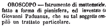 | Oroscopo - Istrumento di mattematiche, fatto a forma di pianisfera, ed inventato da Giovanni Paduanus, che su tal soggetto compilò un trattato particolare. [immagine] |