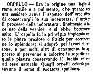 | Orpello - Era in origine una foglia di rame sottile e a pulimento, che quando non era ossidato aveva l'aspetto dell'oro; affine di conservargli la sua lucentezza, s'impiegò il processo della indoratura; finalmente si fece uso della vernice, e si ebbe buonissimo esito. L'orpello fu in principio impiegato sotto le pietre preziose o fittizie per accrescerne lo splendore; si adoprò pei lavori di cartone, e per molti altri di ornamento. In appresso si pervenne a colorire la superficie di quelle piastre conservando il lucido ch'era ad esse naturale. Quegli orpelli coloriti portavano il nome di paglioni (paillons). [immagine] |