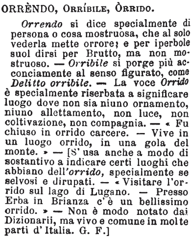 | Orrendo, Orribile, Orrido - Orrendo si dice specialmente di persona o cosa mostruosa, che al solo vederla mette orrore; e per iperbole suol dirsi per Brutto, ma non mostruoso. - Orribile si porge più acconciamente al senso figurato, come Delitto orribile. - La voce Orrido é specialmente riserbata a significare luogo dove non sia niuno ornamento, niuno allettamento, non luce, non coltivazione, non compagnia. - «Fu chiuso in orrido carcere. - Vive in un luogo orrido, in una gola del monte.» [S'usa anche a modo di sostantivo a indicare certi luoghi che abbiano dell'orrido, specialmente se selvosi e dirupati. - «Visitare l'orrido sul lago di Lugano. - Presso Erba in Brianza c'è un bellissimo orrido.» - Non è modo notato dai Dizionarii, ma vivo e comune in molte parti d'Italia. G. F.] [immagine] |