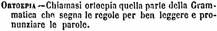 | Ortoepia - Chiamasi ortoepia quella parte della Grammatica che segna le regole per ben leggere e pronunziare le parole. [immagine] |