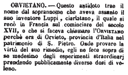 | Orvietano - Questo antidoto trae il nome dal soprannome che aveva assunto il suo inventore Luppi, ciarlatano, il quale si recò in Francia sul cominciare del secolo XVII, e che si faceva chiamare l'Orvietano perchè era di Orvieto, provincia d'Italia nel patrimonio di S.Pietro. Onde provare la virtù del suo rimedio, egli ne fece sopra di se medesimo degli esperimenti straordinarj prendendo pubblicamente diverse dosi di veleno. [immagine] |