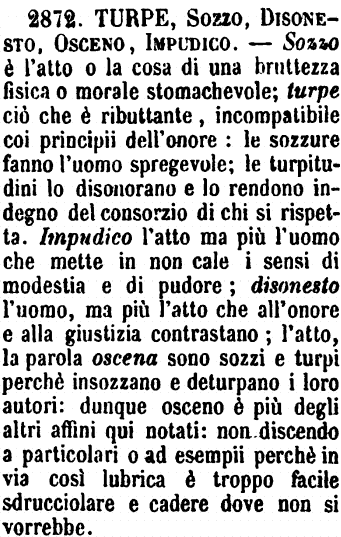 | Turpe, Sozzo, Disonesto, Osceno, Impudico - Sozzo è l'atto o la cosa di una bruttezza fisica o morale stomachevole: turpe ciò che è ributtante, incompatibile coi principii dell'onore: le sozzure fanno l'uomo spregevole; le turpitudini lo disonorano e lo rendono indegno del consorzio di chi si rispetta. Impudico l'atto ma più l'uomo che mette in non cale i sensi di modestia e di pudore: disonesto l'uomo, ma più l'atto che all'onore e alla giustizia contrastano; l'atto, la parola oscena sono sozzi e turpi perchè insozzano e deturpano i loro autori: dunque osceno è più degli altri affini qui notati: non discendo a particolari od ad esempii perchè in via così lubrica e troppo facile sdrucciolare e cadere dove non si vorrebbe. [immagine] |