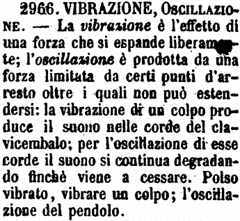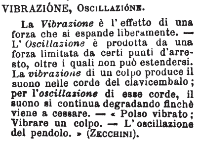 | Vibrazione, Oscillazione - La Vibrazione è l'effetto di una forza che si espande liberamente. - L'Oscillazione è prodotta da una forza limitata da certi punti d'arresto, oltre i quali non può estendersi. La vibrazione di un colpo produce il suono nelle corde del clavicembalo; per l'oscillazione di esse corde, il suono si continua degradando finchè viene a cessare. - «Polso vibrato; Vibrare un colpo. - L'oscillazione del pendolo.» (Zecchini). [immagine] |