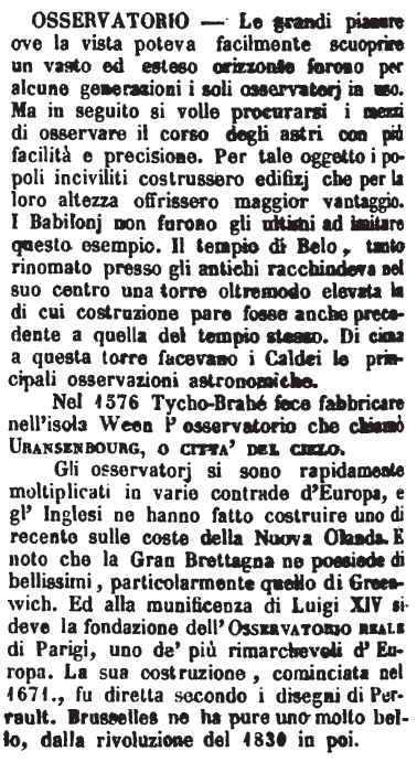 | Osservatorio - Le grandi pianure ove la vista poteva facilmente scuoprire un vasto ed esteso orizzonte furono per alcune generazioni i soli osservatorj in uso. Ma in seguito si volle procurarsi i mezzi di osservare il corso degli astri con più facilità e precisione. Per tale oggetto i popoli inciviliti costrussero edifizj che per la loro altezza offrissero maggior vantaggio. I Babilonj non furono gli ultimi ad imitare questo esempio. Il tempio di Belo, tanto rinomato presso gli antichi racchiudeva nel suo centro una torre oltremodo elevata la di cui costruzione pare fosse anche precedente a quella del tempio stesso. Di cima a questa torre facevano i Caldei le principali osservazioni astronomiche.