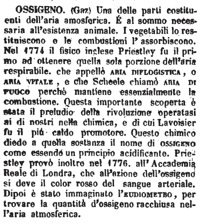 T. Cuvier: La potenza vitale si potrebbe dedurre con proporzioni matematiche dalla quantità dell'ossigeno assorbito. – La foglia decompone potentemente l'acido carbonico, e lascia andare l'ossigeno. Ossigeno meglio che Ossigene. |
