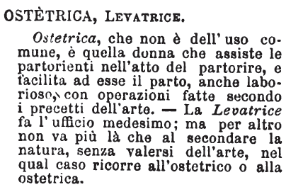 | Ostetrica, Levatrice - Ostetrica, che non è dell'uso comune, è quella donna che assiste le partorienti nell'atto del partorire, e facilita ad esse il parto, anche laborioso, con operazioni fatte secondo i precetti dell'arte. - La Levatrice fa l'ufficio medesimo; ma per altro non va più là che al secondare la natura, senza valersi dell'arte, nel qual caso ricorre all'ostetrico o alla ostetrica. [immagine] |