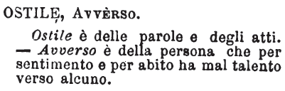 | Ostile, Avverso - Ostile è delle parole e degli atti. - Avverso è della persona che per sentimento e per abito ha mal talento verso alcuno. [immagine] |