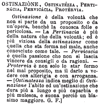 | Ostinazione, Ostinatezza, Pertinacia, Pervicacia, Protervia - Ostinazione è della volontà che non si parte da un proposito o da un'opera, benchè la conosca folle e pericolosa. - La Pertinacia è più della natura che della volontà; ed è più viziosa della ostinazione come quella che sta ferma nel male, anche conosciuto come tale. - Pervicacia è quella passione che non si lascia vincere da consigli o da ragioni. - Protervia è non solo lo star fermo nel mal proposito, ma il darlo a vedere con alterigia e con arroganza. - [Ostinatezza indica meglio di Ostinazione l'abito ed un'ostinazione che dura più a lungo e più caparbia e più mulesca, e suona perciò un biasimo maggiore. G. F.] [immagine] |