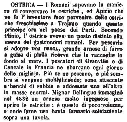 | Ostrica - I Romani sapevano la maniera di conservare le ostriche, ed Apicio che ne fu l'inventore fece pervenire delle ostriche freschissime a Trajano quando questo principe era nel paese dei Parti. Secondo Plinio, l'ostrica aveva un posto distinto alla mensa dei gastronomi romani. Per pescarle si adopra una draga, grande arnese di ferro a guisa di pialla ricurva che le raccoglie in fondo al mare. I pescatori di Granville e di Cancale in Francia ne sbarcano ogni giorno delle migliaja. Più se ne pescano, e più sembra si vengano moltiplicando; sono attaccate a banchi di sabbia e addossate una all'altra in masse enormi. Mignar Bellingue immaginò nel 1832 un arnese molto ingegnoso per aprire le ostriche: è questo di poco volume, e onde farne uso basta fermarlo solidamente sopra una tavola. [immagine] |