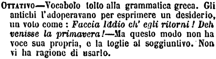 | Ottativo - Vocabolo tolto alla grammatica greca. Gli antichi l'adoperavano per esprimere un desiderio, un voto come: Faccia Iddio ch'egli ritorni! Deh venisse la primavera! - Ma questo modo non ha voce sua propria, e la toglie al soggiuntivo. Non vi ha ragione di usarlo. [immagine] |