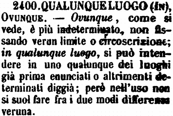 | Qualunqueluogo (in), Ovunque - Ovunque, come si vede, è più indeterminato, non fissando verun limite o circoscrizione; in qualunque luogo, si può intendere in uno qualunque dei luoghi già prima enunciati o altrimenti determinati diggià; però nell'uso non si suol fare fra i due modi differenza veruna. [immagine] |