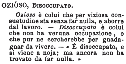 | Ozioso, Disoccupato - Ozioso è colui che per viziosa consuetudine sta senza far nulla, e aborre dal lavoro. - Disoccupato è colui che non ha veruna occupazione, e che pur ne cercherebbe per guadagnar da vivere. - «È disoccupato, e si viene a noja; ma ancora non ha trovato da far nulla.» [immagine] |