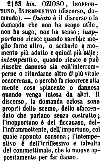 | Ozioso, Inopportuno, Intempestivo (discorso, domanda) - Ozioso è il discorso o la domanda che non ha scopo utile, non ha sugo; non ha senso; inopportuno riesce quando sarebbe meglio farne altro, o serbarlo a momento più adatto e quindi più utile; intempestivo, quando riesce o può riuscire dannoso sia coll'interromperne o ritardarne altro di più vitale occorrenza, o perchè fa ricorrere alla mente cosa spiacente o dannosa quando venga intesa da altri. Il discorso, la domanda oziosa sono proprii dello scemo, dello sfaccendato che parlano senza costrutto; l'inopportuno è del ficcanaso, dell'inframmettente, dell'importuno, col quale appunto consona; l'intempestivo è dell'irriflessivo e talvolta del commettimale, che lo muove appositamente per far danno. [immagine] |