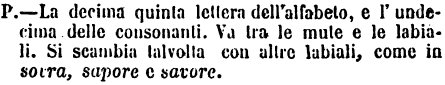 | P - La decima quinta lettera dell'alfabeto, e l'undecima delle consonanti. Va tra le mute e le labiali. Si scambia talvolta con altre labiali, come in sovra, sapore e savore. [immagine] |