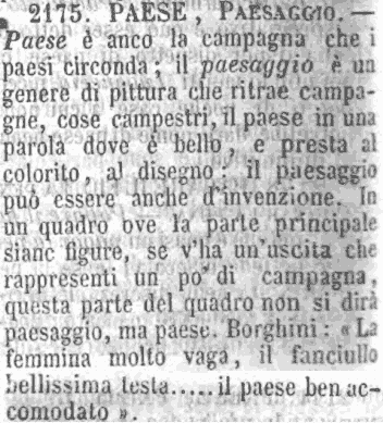 | Paese, Paesaggio - Paese è anco la campagna che i paesi circonda; il paesaggio è un genere di pittura che ritrae campagne, cose campestri, il paese in una parola dove è bello, e presta al colorito, al disegno: il paesaggio può essere anche d'invenzione. In un quadro ove la parte principale siano figure, se v'ha un'uscita che rappresenti un po' di campagna, questa parte del quadro non si dirà paesaggio, ma paese. Borghini: « La femmina molto vaga, il fanciullo bellissima testa.....il paese ben accomodato ». [immagine] |