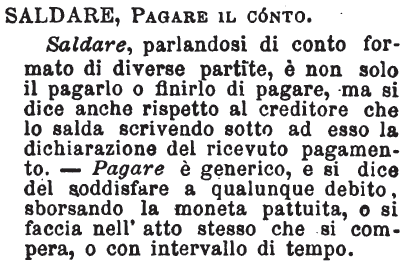 | Saldare, Pagare il conto - Saldare, parlandosi di conto formato di diverse partite, è non solo il pagarlo o finirlo di pagare, ma si dice anche rispetto al creditore che lo salda scrivendo sotto ad esso la dichiarazione del ricevuto pagamento. Pagare è generico, e si dice del soddisfare a qualunque debito, sborsando la moneta pattuita, o si faccia nell'atto stesso che si compera, o con intervallo di tempo. [immagine] |