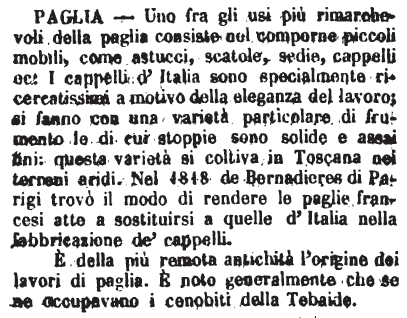 | Paglia - Uno fra gli usi più rimarchevoli della paglia consiste nel comporne piccoli mobili, come astucci, scatole, sedie, cappelli ec: I cappelli d'Italia sono specialmente ricercatissimi a motivo della eleganza del lavoro; si fanno con una varietà particolare di frumento le di cui stoppie sono solide e assai fini: questa varietà di coltiva in Toscana nei terreni aridi. Nel 1818 da Bernadieres di Parigi trovò il modo di rendere le paglie francesi atte a sostituirsi a quelle d'Italia nella fabbricazione de' cappelli.