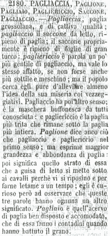 | Pagliaccia, Paglione, Pagliaio, Pagliericcio, Saccone, Pagliaccio - Pagliaccia, paglia grossolana, e di cattiva qualità; pagliaccio il saccone da letto, ripieno di paglia; il saccone propriamente è ripieno di foglie di granturco: pagliericcio è parola un po' più gentile di pagliaccio, ma vale lo stesso affatto, se non forse anche più sottile e meschino; ma il popolo cerca egli pure d'alleviare almeno l'idea della sua miseria coi vezzeggiativi. Pagliaccio ha poi altro senso; è la maschera buffonesca da tutti conosciuta: e pagliericcio è la paglia più trita che rimane sotto la paglia più intiera. Paglione dice anco ciò che pagliaccio e pagliericcio nel primo senso; ma esprime maggior grandezza e abbondanza di paglia: poi significa quello strato di essa che a guisa di letto si mette sotto ai cavalli perchè vi si riposino e per farne letame a un tempo; egli è curioso però ad osservare che queste tre parole hanno ognuna un altro significato. Pagliaio è quell'acervo di paglia ben disposto e accomodato, che di essa fanno i contadini quando hanno battuto il grano. [immagine] |