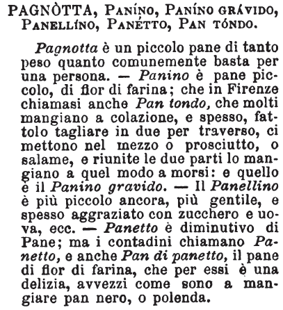 | Pagnotta, Panino, Panino gravido, Panellino, Panetto, Pan tondo - Pagnotta è un piccolo pane di tanto peso quanto comunemente basta per una persona. - Panino è pane piccolo, di fior di farina; che in Firenze chiamasi anche Pan tondo, che molti mangiano a colazione, e spesso, fattolo tagliare in due per traverso, ci mettono nel mezzo o prosciutto, o salame, e riunite le due parti lo mangiano a quel modo a morsi: e quello è il Panino gravido. - Il Panellino è più piccolo ancora, più gentile, e spesso aggraziato con zucchero e uova, ecc. - Panetto è diminutivo di Pane; ma i contadini chiamano Panetto, e anche Pan di panetto, il pane di fior di farina, che per essi è una delizia, avvezzi come sono a mangiare pan nero, o polenda. [immagine] |