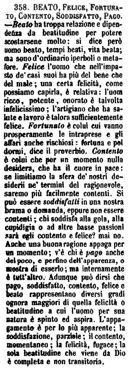 | Beato, Felice, Fortunato, Contento, Soddisfatto, Pago - Beato ha troppa relazione e dipendenza da beatitudine per potere scostarsene molto: si dice però uomo beato, tempi beati, vita beata; ma sono d'ordinario iperboli o metafore. Felice l'uomo che nell'impasto de' casi suoi ha più del bene che del male; una certa felicità, come possiamo capirla, è relativa: l'uom ricco, potente, onorato è talvolta infelicissimo; l'artigiano che ha salute e lavoro è talora sufficientemente felice. Fortunato è colui cui vanno prosperamente le intraprese e gli affari anche rischiosi: fortuna e poi dormi, dice il proverbio. Contento è colui che per un momento nulla desidera, che ha il cuore in pace: se limitiamo la sfera de' nostri desiderii ne' termini del ragionevole, saremo più facilmente contenti. Si può essere soddisfatti in una nostra brama o domanda, eppure non essere contenti; chi soddisfa alla gola, alla cupidigia o ad altre basse passioni sarà egli contento e felice? mai no. Anche una buona ragione appaga per un momento; v'è chi è pago anche del poco, e perfino dell'apparenza, o mostra di esserlo; ma internamente è tutt'altro. Adunque può dirsi che pago, soddisfatto, contento, felice e beato rappresentano diversi gradi ognora maggiori di quella felicità o beatitudine a cui l'uomo per sua natura è spinto ed aspira. L'appagamento è per lo più apparente; la soddisfazione, parziale; il contento, momentaneo; la felicità, fugace; la sola beatitudine che viene da Dio è completa e non transitoria. [immagine] |