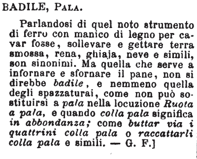 | Badile, Pala - Parlandosi di quel noto strumento di ferro con manico di legno per cavar fosse, collevare e gettare terra smossa, rena, ghiaja, neve e simili, son sinonimi. Ma quella che serve a infornare e sfornare il pane, non si direbbe badile, e nemmeno quella della spazzaturai, come non può sostituirsi a pala nella locuzione Ruota a pala, e quando colla pala significa in abbondanza; come buttar via i quattrini colla pala o raccattarli colla pala e simili - G. F. [immagine] |