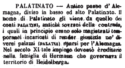 | Palatinato - Antico paese d'Alemagna, diviso in basso ed alto Palatinato. Il nome di Palatinato gli viene da quello dei conti palatini, antichi sovrani della contrada, i quali in principio erano solo magistrati temporanei incaricati di render giustizia ne' diversi palazzi (palatia) sparsi per l'Alemagna. Nel secolo XI tale impiego doventò ereditario nella famiglia di Hermann che governava il territorio di Heidelberga. [immagine] |