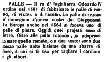 | Palle - Il re d'Inghilterra Odoardo IV ordinò nel 1481 di fabbricare le palle di FERRO, di PIETRA e di PIOMBO. Le palle di STAGNO s'impiegano a'giorni nostri dai Giapponesi. In Europa anche nel 1564 si faceva usa di palle di pietra. Oggidì quei projetti sono di ferro. Oltre alle palle rotonde, si adoprano in mare quelle ramate, o a due teste: sono due mezze palle unite insieme da una sbarra di ferro, di cui si fa uso per tagliare i cordami e gli alberi. [immagine] |