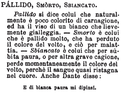 | Pallido, Smorto, Sbiancato - Pallido si dice di colui che naturalmente è poco colorito di carnagione, ed ha il viso di un bianco che lievemente gialleggia. - Smorto è colui che è pallido molto, che ha perduto il colore del volto, e ciò per malattia. - Sbiancato è colui che per subita paura, o per altra grave cagione, perde momentaneamente il colore del volto, perchè il sangue quasi ristagna nel cuore. Anche Dante disse: