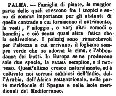 | Palma - Famiglia di piante, la maggir parte delle quali crescono fra i tropici e sono di somma importanza per gli abitanti di quelle contrade a cui forniscono il nutrimento, le vesti, l'alloggio, e varj altri comodi e benefizj, e ciò senza quasi altra fatica che la coltivazione. I palmizj sono rimarchevoli per l'altezza a cui arrivano, il fogliame sempre verde che ne adorna la cima, e l'abbondanza dei frutti. In Europa se ne producono sole due specie, la palma semplice, e il dattero. Quest'ultimo cresce naturalmente, ed è coltivato nei terreni sabbiosi dell'Indie, dell'Arabia, dell'Africa settentrionale, nella parte meridionale di Spagna e nelle Isole meridionali del Mediterraneo. [immagine] |