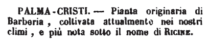 | Palma-Cristi - Pianta originaria di Barberia, coltivata attualmente nei nostri climi, e più nota sotto il nome di Ricine. [immagine] |