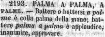| Palma a palma, A palme - Battere o battersi a palme è colla palma della mano; battere palma a palma è applaudire, inanimire, approvare. [immagine] |