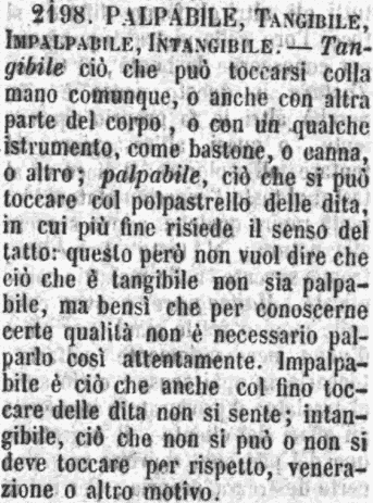 | Palpabile, Tangibile, Impalpabile, Intangibile - Tangibile ciò che può toccarsi colla mano comunque, o anche con altra parte del corpo, o con un qualche istrumento, come bastone, o canna, o altro; palpabile, ciò che si può toccare col polpastrello delle dita, in cui più fine risiede il senso del tatto: questo però non vuol dire che ciò che è tangibile non sia palpabile, ma bensì che per conoscerne certe qualità non è necessario palparlo così attentamente. Impalpabile è ciò che anche col fino toccare delle dita non si sente; intangibile, ciò che non si può o non si deve toccare per rispetto, venerazione o altro motivo. [immagine] |