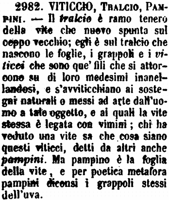 | Viticcio, Tralcio, Pampini - Il tralcio è ramo tenero della vite che nuovo spunta sul ceppo vecchio; egli è sul tralcio che nascono le foglie, i grappoli e i viticci che sono que' fili che si attorcono su di loro medesimi inanellandosi, e s'avviticchiano ai sostegni naturali o messi ad arte dall'uomo a tale oggetto, e ai quali la vite stessa è legata con vimini; chi ha veduto una vite sa che cosa siano questi viticci, detti da altri anche pampini. Ma pampino è la foglia della vite, e per poetica metafora pampini diconsi i grappoli stessi dell'uva. [immagine] |
