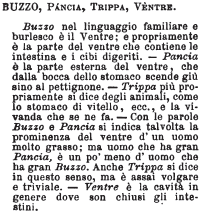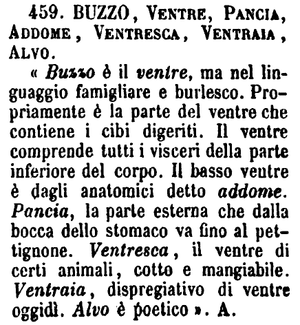 | Buzzo, Ventre, Pancia, Addome, Ventresca, Ventraia, Alvo - « Buzzo è il ventre, ma nel linguaggio famigliare e burlesco. Propriamente è la parte del ventre che contiene i cibi digeriti. Il ventre comprende tutti i visceri della parte inferiore del corpo. Il basso ventre è dagli anatomici detto addome. Pancia, la parte esterna che dalla bocca dello stomaco va fino al pettignone. Ventresca, il ventre di certi animali, cotto e mangiabile. Ventraia, dispregiativo di ventre oggidì. Alvo è poetico ». A. [immagine] |