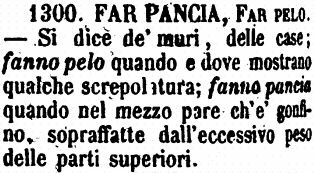 | Far pancia, Far pelo - Si dice de' muri, delle case; fanno pelo quando e dove mostrano qualche screpolatura; fanno pancia quando nel mezzo pare ch'è gonfino, sopraffatte dall'eccessivo peso delle parti superiori. [immagine] |