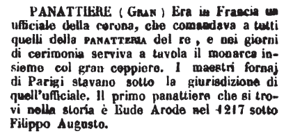 | Panattiere (Gran) - Era in Francia un ufficiale della corona, che comandava a tutti quelli della panatteria del re, e nei giorni di cerimonia serviva a tavola il monarca insieme col gran coppiere. I maestri fornaj di Parigi stavano sotto la giurisdizione di quell'ufficiale. Il primo panattiere che si trovi nella storia è Eude Arode nel 1217 sotto Filippo Augusto. [immagine] |