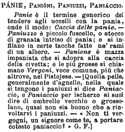 | Panie, Panioni, Paniuzzi, Paniaccio - Panie è il termine generico del tendere agli uccelli con la pania, onde il modo: Caccia delle panie. - Paniuzzo è piccolo fuscello, o stecco di granata intriso di pania; e si infilano in certe tacche fatte ne' rami di un albero. - Panione è mazza impaniata che si adopra alla caccia della civetta; e le più grosse si chiamano Vergoni, voce comune, più che altrove, nel Pistojese. - [Quella pelle, generalmente d'agnello, nella quale si tengono i paniuzzi si dice Paniaccio, e Paniaccio per ischerzo si suol dire di ombrello vecchio o grossolano, quasi non sia buono che a rinvoltarvi i paniuzzi. - «Non ti vergogni, un signore come te, a portare cotesto paniaccio?» G. F.] [immagine] |