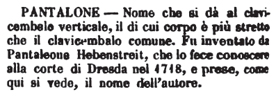 | Pantalone - Nome che si da al clavicembalo verticale, il di cui corpo è più stretto che il clavicembalo comune. Fu inventato da Pantaleone Hebenstreit, che lo fece conoscere alla corte di Dresda nel 1718, e prese, come qui si vede, il nome dell'autore. [immagine] |