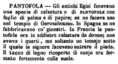 | Pantofola - Gli antichi Egizi facevano una specie di calzatura o di pantofole con foglie di palma e di papiro; se ne faceva uso nel tempio di Gerusalemme. In Spagna se ne fabbricavano co' ginestri. In Francia la pantofola era in addietro calzatura da donne; non aveva i quarti, ma soltanto un tomajo sotto il quale le signore facevano entrare il piede. Il tacco di legno ricoperto di cuojo era fermato fortemente colla suola. [immagine] |