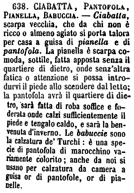 | Ciabatta, Pantofola, Pianella, Barbuccia - Ciabatta, scarpa vecchia, che da chi non è ricco o almeno agiato si porta talora per casa a guida di pianella e di pantofola. La pianella è scarpa comoda, sottile, fatta apposta senza il quartiere di dietro, onde senz'altra fatica o attenzione si possa introdurvi il piede allo scendere dal letto; la pantofola avrà il quartiere di dietro, sarà fatta di roba soffice e foderata onde calzi sufficientemente il piede e tengalo caldo, e sarà la benvenuta d'inverno. Le babuccie sono la calzatura de' Turchi: è una specie di pantofola di marocchino variamente colorito; anche da noi si usano per calzatura da camera a guida or di pantofole, or di pianelle. [immagine] |