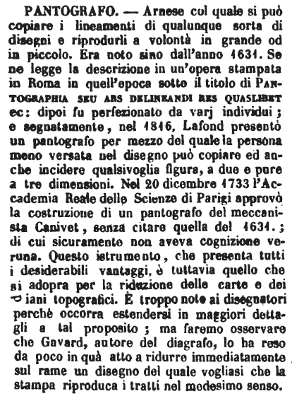 | Pantografo - Arnese col quale si può copiare i lineamenti di qualunque sorta di disegni e riprodurli a volontà in grande od in piccolo. Era noto sino dall'anno 1631. Se ne legge la descrizione in un'opera stampata in Roma in quell'epoca sotto il titolo di Pantographia seu ars delineandi res quaslibet ec: dipoi fu perfezionato da varj individui; e segnatamente, nel 1816, Lafond presentò un pantografo per mezzo del quale la persona meno versata nel disegno può copiare ed anche incidere qualsivoglia figura, a due e pure a tre dimensioni. Nel 20 dicembre 1733 l'Accademia Reale delle Scienze di Parigi approvò la costruzione di un pantografo del meccanista Canivet, senza citare quella del 1631.; di cui sicuramente non aveva cognizione veruna. Questo istrumento, che presenta tutti i desiderabili vantaggi, è tuttavia quello che si adopra per la riduzione delle carte e dei piani topografici. E' troppo noto ai disegnatori perchè occorra estendersi in maggiori dettagli a tal proposito; ma faremo osservare che Gavard, autore del diagrafo, lo ha reso da poco in quà atto a ridurre immediatamente sul rame un disegno del quale vogliasi che la stampa riproduca i tratti nel medesimo senso. [immagine] |
