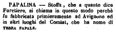 | Papalina - Stoffa, che a quanto dice Furetiere, si chiama in questo modo perchè fu fabbricata primieramente ad Avignone ed in altri luoghi del Comtat, che ha nome di terra papale. [immagine] |
